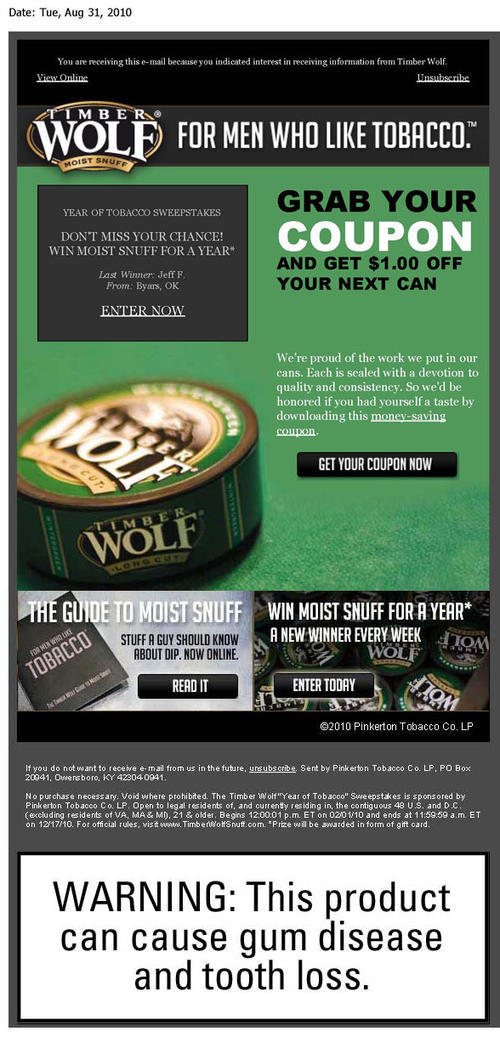 E-mail from Timber Wolf sent in August 2010 advertising new coupons available for printing from the brand's website.