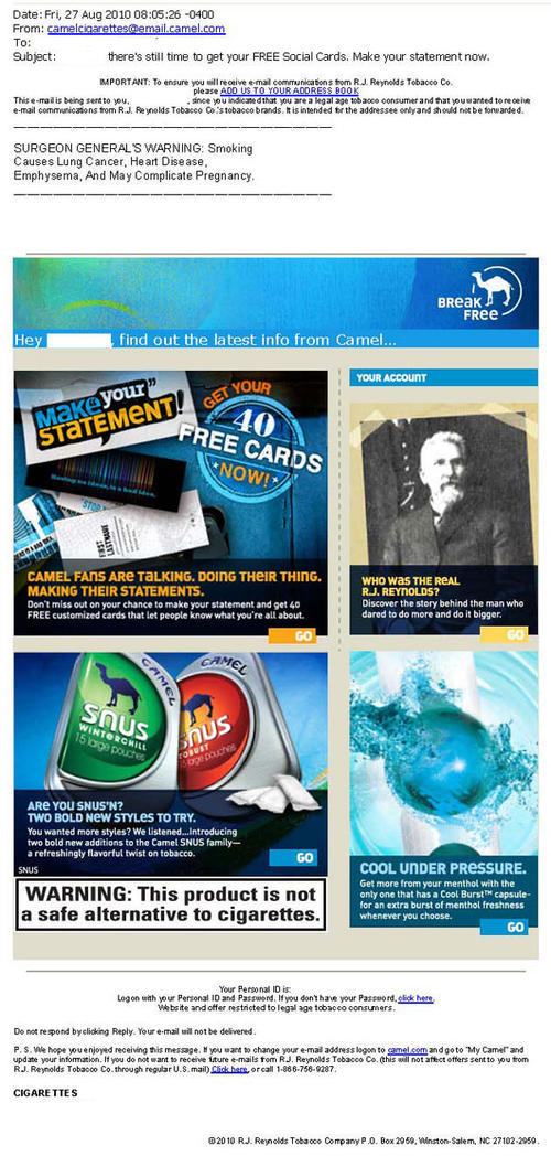 Email from Camel promoting the brand's different products, including two new styles of Camel Snus, Robust and Winterchill, and a new gift promotion available from the brand's website. The “make your statement” promotion offers 40 free customized cards. Users can have their personal information (e.g., name, email address) printed on one side of the card, and pick a “favorite quote, saying or mantra” to be printed on the other side .