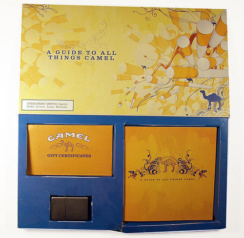 Direct mail sent in the summer of 2007 presenting "a guide to all things Camel" booklet, a free zippo lighter, and 4 coupons, each for $1.75 off a pack of cigarettes. The "guide" booklet profiles Camel's different product styles.