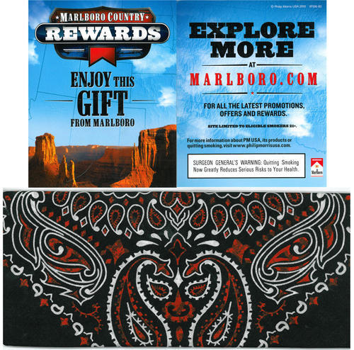 Western themed bandana, sent as a free gift by direct mail from Marlboro. This gift was one of three items offered (key chain, bottle opener, or bandana)as part of Marlboro's 2010 Country Rewards program. Smokers were able to choose the gift they wanted on Marlboro's website, Marlboro.com.