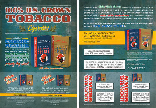 Two-sided ad in promotion of Natural American Spirit as 100% U.S. grown tobacco. Text: "On the cosmic scale it may be a small thing. But then, to the many farmers we support it's actually a pretty big deal." Piece also includes to tear away cards to give to friends to "share the love". Each card advertises a promotion for $20 in gift certificates/coupons.