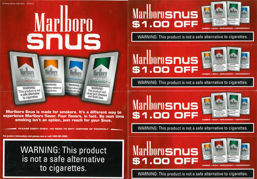 Direct mail in promotion of Marlboro Snus sent in September 2010, including four coupons for $1.00 off a pack of Marlboro Snus.