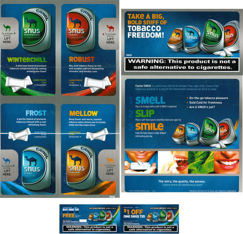 Direct mail in promotion of Camel Snus including tabs that readers can open for a whiff of the aroma of each of the four product styles. The piece also includes images of the pouches that are true to size, which visually distinguish the larger pouches of the new Winterchill and Robust styles from the smaller pouches of the Frost and Mellow styles. Two coupons are included - one coupon for $1.00 off one tin, and one "buy one tin get one tin free" coupon.