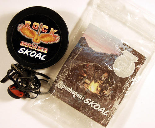 Skoal "Rock the Rockies" Radio with earphones. Black and brown logo of guitar with wings. FM radio in plastic bag with image of camping scene.
