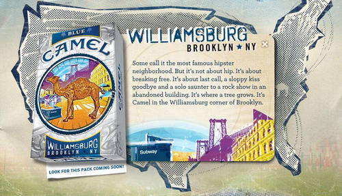 Image of a destination themed Camel cigarette pack, featuring the neighborhood of Williamsburg in Brooklyn, New York. This pack is one in a series of “Camel Adventure packs,” part of the Camel Break Free Adventure promotional program launched in September 2010. The promotion includes a traveling themed sweepstakes in which Camel visits 10 different US locations over 10 weeks. Smokers can enter once a week on Camel.com by reading a clue and guessing where Camel is that week.The grand prize is 1,000,000 airline miles to be awarded as $20,000. For each weekly destination, an image of a new package design featuring that location is revealed and described as "coming soon". To see images of all of the featured destination packs and other materials associated with the campaign, type “Break Free Adventure” in the Trinkets keywords search field.