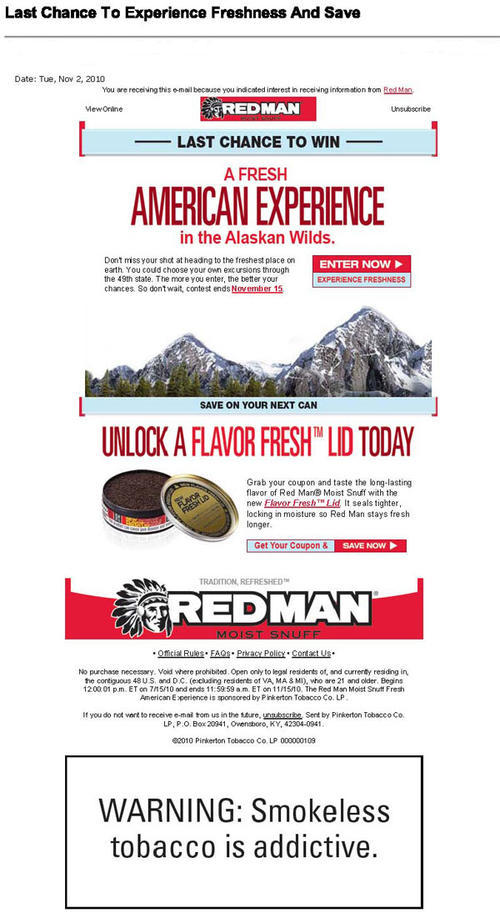 Email from Red Man reminding receivers to enter the Fresh American Experience sweepstakes before it ends on 11/15/2010. The sweepstakes offers a grand prize trip to Alaska with various excursion options. The e-mail also includes a direct link to the website for a Red Man coupon offer.