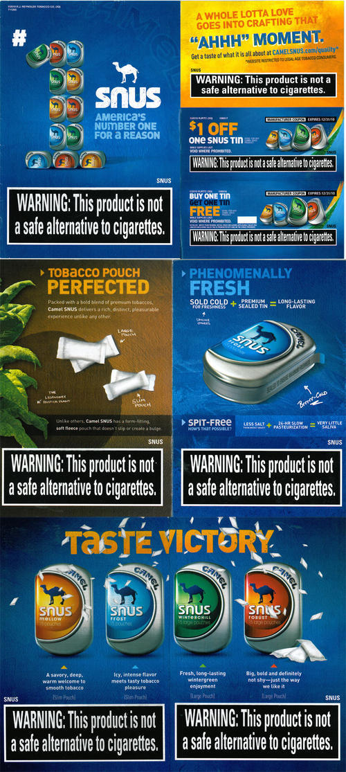 Direct mail in promotion of Camel Snus, referred to as being America's #1 snus "for a reason". The mailing describes different attributes of the product, including its pouch style and spit-free characteristic. Text: "Taste victory." "A whole lotta love goes into crafting that 'ahhh' moment".