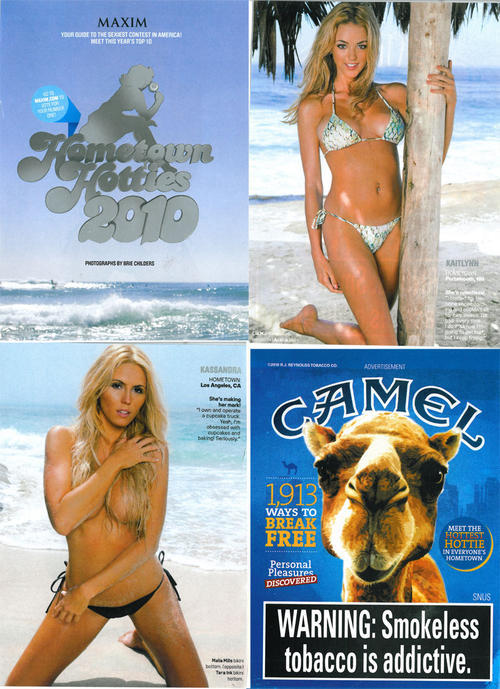 Cover (top left), select pages and back cover (bottom right) of a small insert booklet found in the November 2010 issue of Maxim magazine. The booklet profiles the top 10 female contestants of Maxim's 2010 Hometown Hotties contest, and includes a Camel ad on the back cover. The ad jokingly refers to the camel as being "the hottest hottie in everyone's hometown".