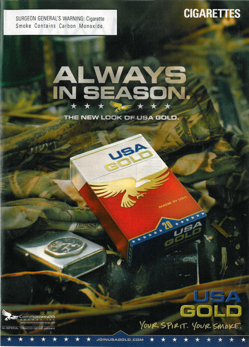 Ad for USA Gold, a discount brand of cigarettes made by Commonwealth Brand, Inc. The advertisement highlights the brand's new packaging and updated look. Image of red pack included. Text: "Re-made in the USA".