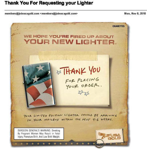 Email from USA Gold, thanking a smoker for visiting the brand's website, and redeeming a free zippo lighter gift offered on the website. Smokers could choose a lighter from one of four different looks/styles - American flag (shown here), 8 ball graphic, camouflage design, or electric guitar graphic.