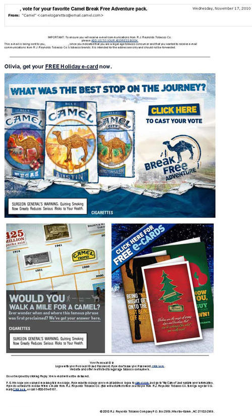 The email also promotes a Camel related timeline feature available on Camel's website, as well as a new holiday e-card feature, where visitors can download various Christmas and holiday themed images that they can send to friends.