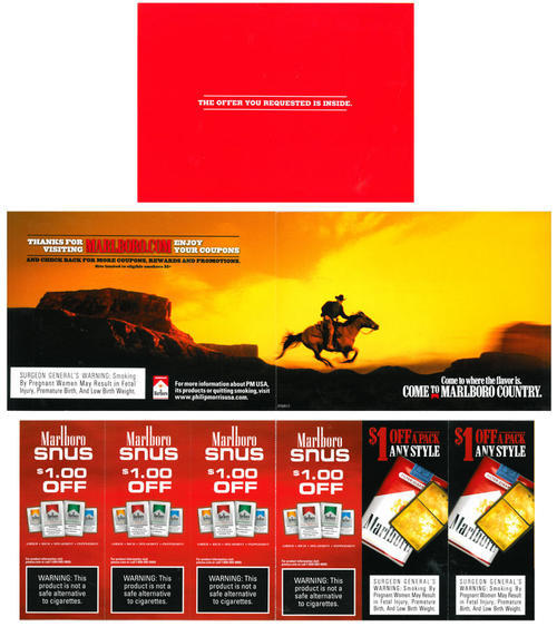 Direct mail piece from Marlboro received in November 2010 thanking the receiver for visiting the brand's website and providing two cigarette coupons that were offered on the website - two coupons for $1.00 off a pack. In addition, four coupons for Marlboro Snus (each for $1.00 off a pack)are included.