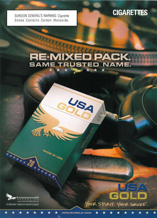 Ad for USA Gold, a discount brand of cigarettes made by Commonwealth Brand, Inc. The advertisement highlights the brand's new packaging and updated look. Image of green pack included. Text: "Re-mixed pack. Same trusted name".