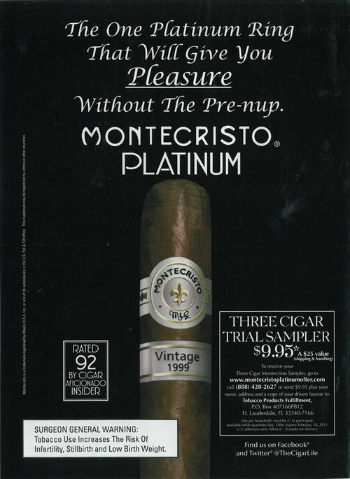 Montecristo Premium cigar ad. Text: "The one platinum ring that will give you pleasure without the pre-nup." Ad includes offer for a three cigar trial sampler for $9.95.