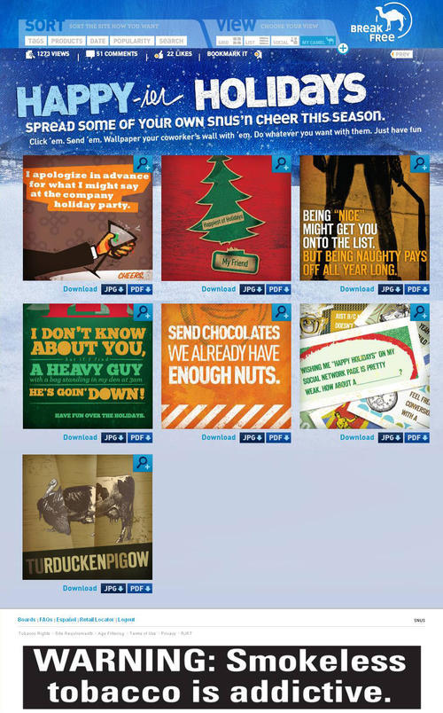 Page from the Camel Snus website (camelsnus.com), recorded in November 2010, featuring free winter holiday images and messages that can be downloaded and used in e-cards or other materials. Each message style can be saved as a pdf or jpeg file. Text: \"Happy-ier Holidays. Spread some of your own snus\'n cheer this season. Click \'em. Send \'em. Wallpaper your coworkers wall with \'em. Do whatever you want with them. Just have fun.\"
