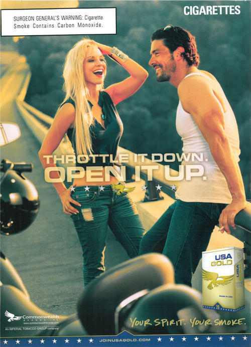 Ad for USA Gold, a discount brand of cigarettes made by Commonwealth Brand, Inc. Ad features an image of couple laughing and smoking by the side of the road with their motorcycles. Image of gold pack included. Text: "Throttle it down. Open it up".