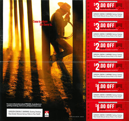 Direct mail from Marlboro featuring an image of a lone cowboy lighting a cigarette during sunset. The piece includes six coupons.