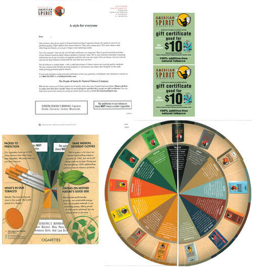Natural American Spirit direct mail including a letter describing the brand's products and a brochure describing the brand's commitment to additive free tobacco and "earth-friendly" practices. The brochure unfolds into a color wheel which provides descriptions about each of the brand's different cigarette styles. The piece also comes with two coupons (for $10 off any brand products of greater value) that were offered in a previous mailing and redeemed by the receiver.