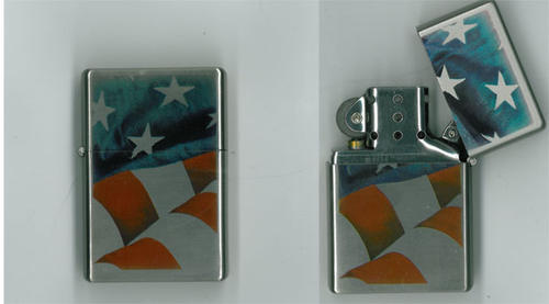 Zippo lighter with American Flag design sent as a gift by direct mail from USA Gold cigarettes. The gift was offered previously on the brand's website.