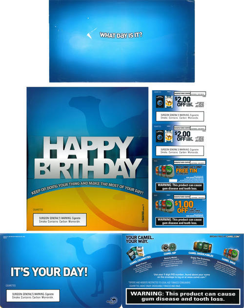 Birthday card sent by direct mail from Camel. Text: "What day is it? It's your day! Happy Birthday! Keep on doing your thing and make the most of your day!".
