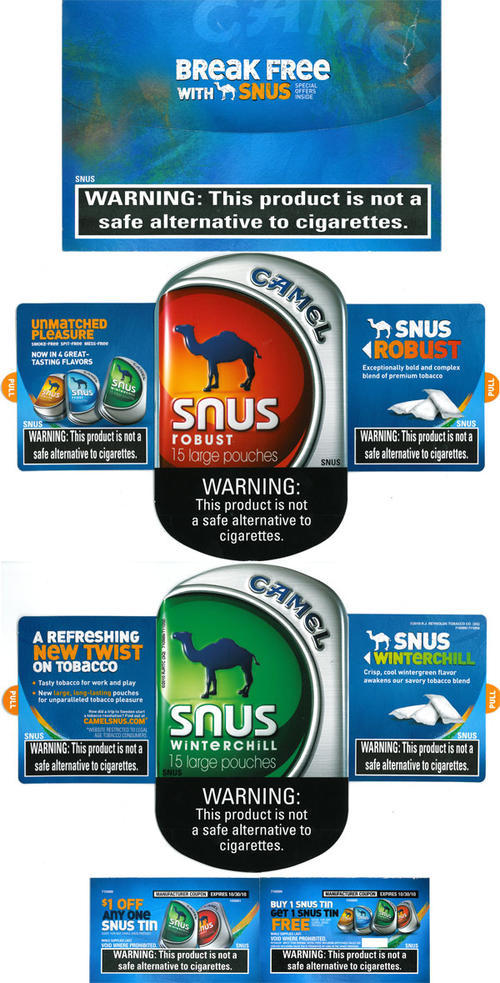 Direct mail in promotion of Camel Snus, including two new styles, Winterchill and Robust. Text: "A refreshing twist on tobacco. Slim tobacco pouches to enjoy anytime, anywhere. Delicious tobacco pleasure that's smoke-free so you can be." Piece comes with two coupons: one for $1.00 off a tin of Camel Snus, and one buy one get one free Camel Snus coupon.