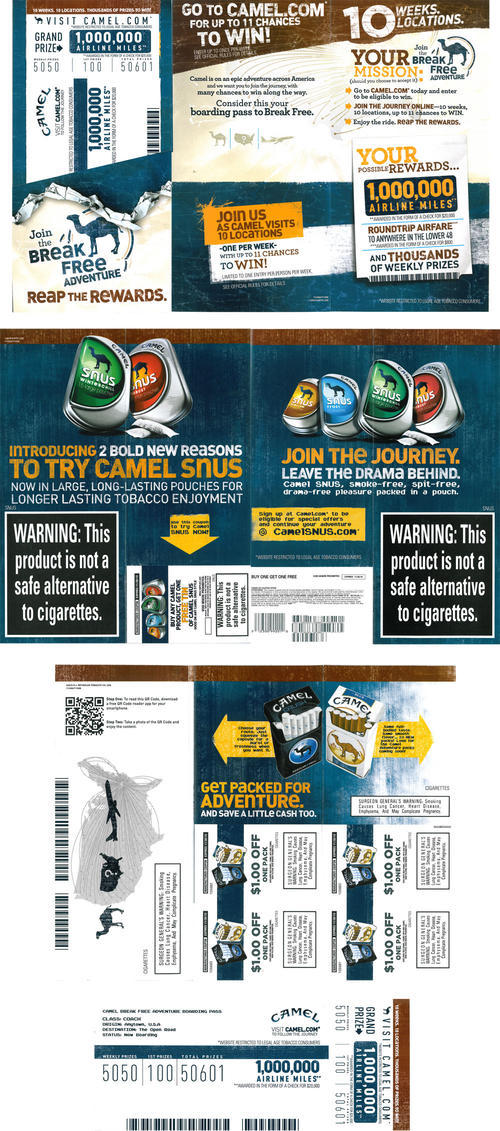 Camel direct mail in promotion of a traveling themed sweepstakes (The Camel Break Free Adventure) in which the brand visits 10 different US locations over 10 weeks. Smokers can enter once a week on Camel.com by reading a clue and guessing where Camel is that week. The mailing is designed to resemble a boarding pass and describes the sweepstake prizes (including a grand prize of 1,000,000 airline miles awarded as $20,000). Four cigarette coupons (each for $1.00 off a pack) are included. This mailing is nearly identical to another version but also promotes and introduces two new styles of Camel Snus, Robust and Winterchill