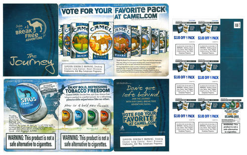 Direct mail related to the travel themed Camel Break Free Adventure promotion. The included booklet mimics a travel passport, and includes images of each of the destination themed Camel Adventure packs. The mailing invites receivers to vote for their favorite pack at Camel.com, and includes 7 coupons. The last pages of the booklet advertises Camel Snus as being a great travel companion. To see images of all of the featured destination packs and other materials associated with the campaign, type “Break Free Adventure” in the Trinkets keywords search field.