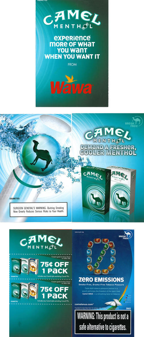 Direct mail piece from RJ Reynolds advertising Camel's new menthol blends. The piece is in promotion with Wawa convenience stores, and includes two coupons for $0.75 off a pack of Camel cigarettes in participating Wawa stores. The piece also advertises Camel Snus, referring to the product as having "zero emissions".