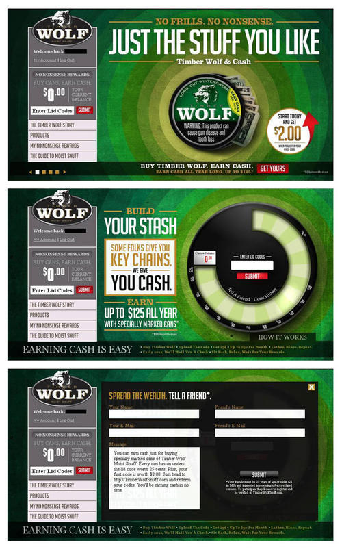 Web pages from the Timber Wolf's website (www.wolfguarantee.com) recorded in January 2011, describing a new brand loyalty promotion. Customers can earn cash by entering codes found in specially marked cans of Timber Wolf. Each code entered online is worth 25 cents and customers can earn up to $125 for the year. Web users can also click on a link to share news about the promotion with a friend.