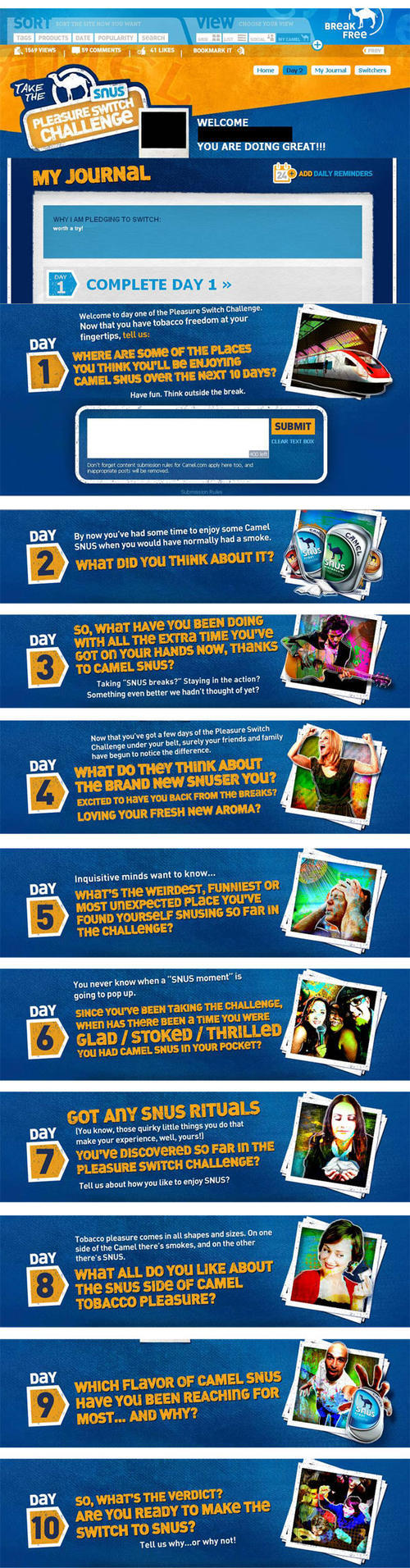 Web pages recorded from Camel.com and Camelsnus.com in December 2010 related to the "Snus Pleasure Switch Challenge." The "challenge" asks smokers to switch to Camel Snus for 10 days and then share about their experience online. When registering to participate in the promotion, web users are given access to a Challenge Journal, in which they can respond to daily questions about their experience with snus during the 10 days.