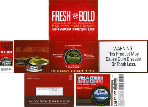 Direct mailing received in October 2010 in introducing Red Man's new "flavor fresh lid". The piece highlights the benefits of the updated lid (e.g., "tighter seal locks in moisture") and includes a sample lid in the mailing. The mailing also promotes the American Experience sweepstakes (which offers a trip to Alaska) and includes a coupon for $1.00 off a can of moist snuff.