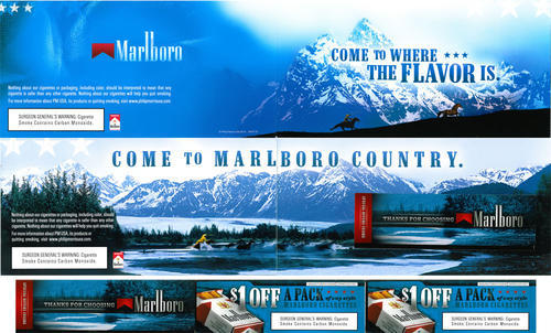 Winter themed Marlboro direct mailing received in December 2010/January 2011 featuring a landscape image with snow covered mountains. "Come to where the flavor is. Come to Marlboro Country." Piece comes with two coupons (each for $1.00 off a pack).