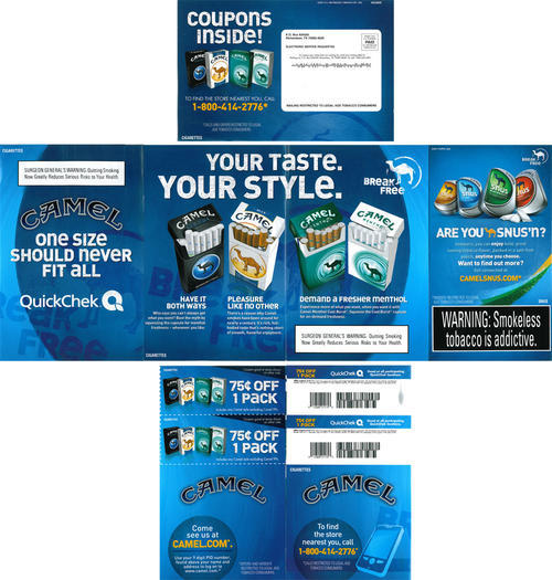 "One size should never fit all." Direct mail piece from RJ Reynolds advertising Camel's various cigarette styles (regular blend, menthol styles, Camel Crush) and Camel Snus smokeless tobacco products. The piece is in promotion with Quick Check convenience stores, and includes two coupons for $0.75 off a pack in participating Quick Check stores.