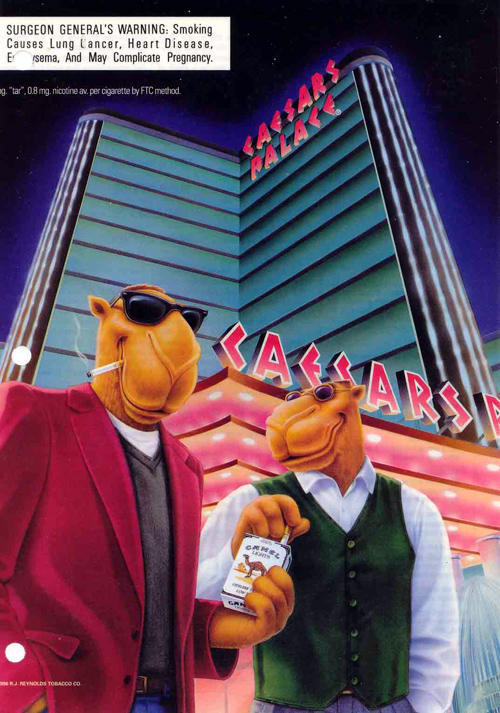 Ad featuring Joe Camel and a friend smoking outside of Caesar's Palace in Las Vegas.