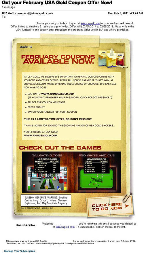 Email from USA Gold directing the receiver to the brand's website for coupons offered during February 2011. The e-mail also encourages the receiver to check out games offered on the brand's website.