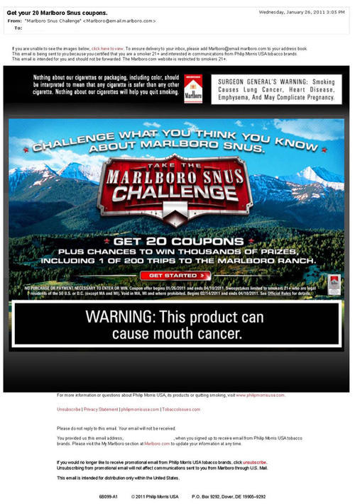 Email received in January 2011 advertising the Marlboro Snus Challenge, a sweepstakes in which participants can answer weekly questions about Marlboro Snus on Marlboro.com for a chance to win a weekly prize or a period end grand prize to the Marlboro Ranch. The sweepstakes promotion officially begins on February 14, 2011 but before then visitors to the site can redeem an offer for 20 Marlboro Snus coupons by answering one question about Marlboro Snus. To see other materials in T&T related to this promotion, type "Marlboro Snus Challenge" into the keywords field.