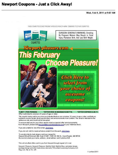 Email sent in February 2011 directing Newport smokers to the brand’s website to find and redeem a coupon offer for the month of February.