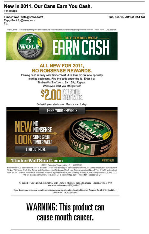 Email received from Timber Wolf in February 2011, describing a new brand loyalty promotion. Customers can earn cash by visiting the brand's website and entering codes found in specially marked cans of Timber Wolf. Each code entered online is worth 25 cents and customers can earn up to $125 for the year. The e-mail also promotes the new look and packaging of the snuff product.