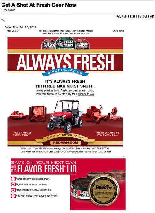 Email sent in February 2011 in promotion of Red Man's Always Fresh Sweepstakes, which participants can enter in daily during the promotional period (2/1/2011 - 9/29/2011). A different prize winner is selected for each month of the promotion. During any given month, the actual prize to be awarded will be based on entry votes for various prize options offered for a given month. E-mail text: "Get a shot at fresh gear now". "It's always fresh with Red Man moist snuff."