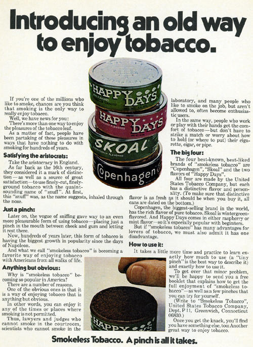 Ad in promotion of Skoal, Copenhagen and Happy Days snuff tobacco aimed at smokers. Text: "Introducing an old way to enjoy tobacco."