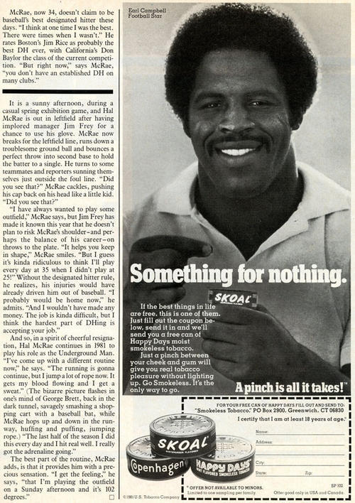 1981 ad in promotion of Skoal, Copenhagen and Happy Days snuff tobacco, featuring an image football star, Earl Campbell. Text: "Something for nothing".