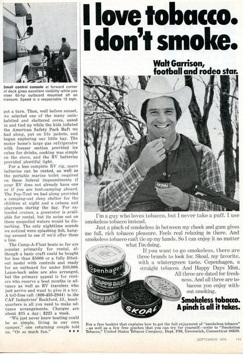 1970s ad in promotion of Skoal, Copenhagen and Happy Days snuff tobacco, featuring an image of and testimonial from football and rodeo star, Walt Garrison. Text: "I love tobacco. I don't smoke."