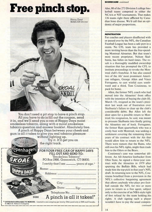 1982 ad in promotion of Skoal, Copenhagen and Happy Days snuff tobacco, featuring an image of and endorsement from Nascar driver, Harry Grant. Text: "Free pinch stop."