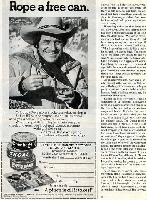 1982 ad in promotion of Skoal, Copenhagen and Happy Days snuff tobacco, featuring an image of football and rodeo star, Walt Garrison. Text: "Rope a free can."