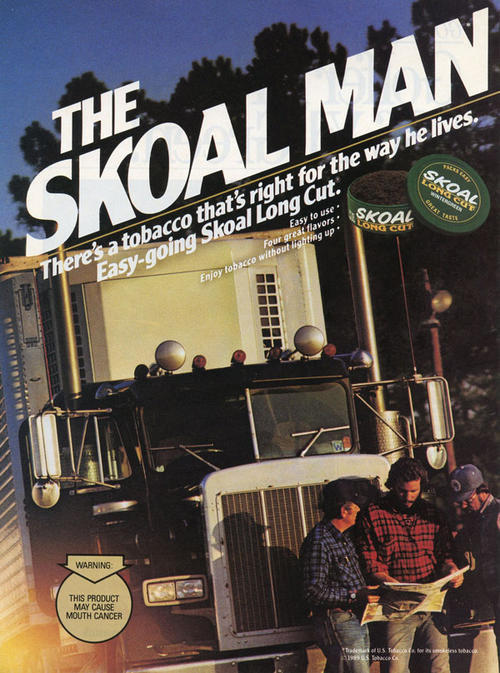 Ad for Skoal snuff using The Skoal Man slogan and featuring an image of three men talking outside of a semi-truck. Text: "There's a tobacco that's right for the way he lives. Easy-going Skoal Long Cut. Easy to use. Four great flavors. Enjoy tobacco without lighting up."