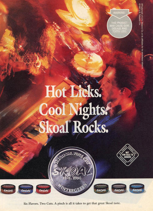 Skoal ad featuring an image of a live band, including a man playing the keyboard. Text: "Hot Licks. Cool Nights. Skoal Rocks." "Six Flavors. Two Cuts. A pinch is all it takes to get that great Skoal taste."