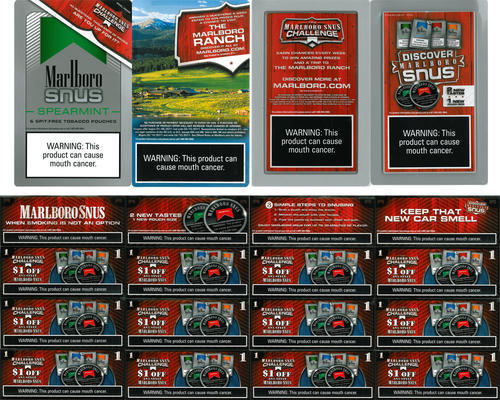 Direct mail from Marlboro Snus in promotion of the Marlboro Snus Challenge, a sweepstakes in which participants can answer weekly questions about Marlboro Snus on Marlboro.com for a chance to win a weekly prize or a period end grand prize to the Marlboro Ranch. The sweepstakes promotion officially began on February 14, 2011 but before then visitors to the site could redeem an offer for 20 Marlboro Snus coupons by answering one question about Marlboro Snus. The 20 offered coupons were sent in this mailing, with each worth $1.00 off a package of Marlboro Snus. The design of the mailing itself resembles an oversized Marlboro Snus packet.