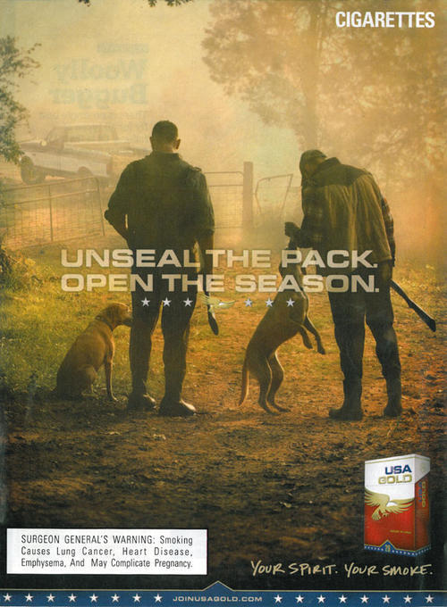 Ad for USA Gold, a discount brand of cigarettes made by Commonwealth Brand, Inc. Ad features a hunting themed image, including two men with rifles and dogs. Text: "Unseal the pack. Open the season."