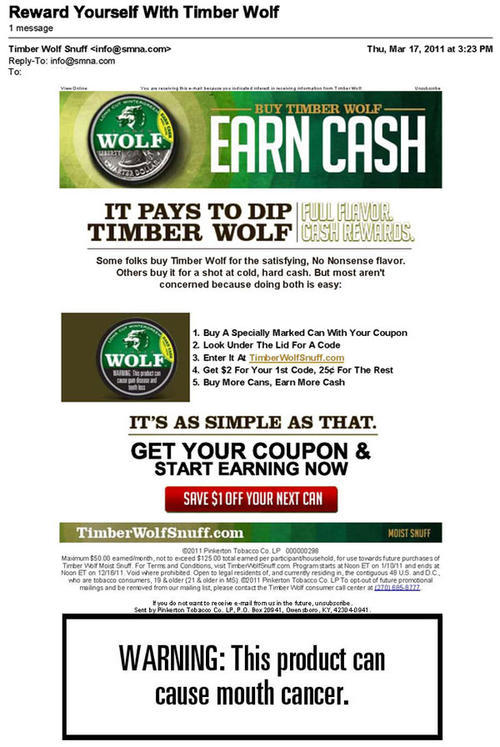Email received from Timber Wolf in March 2011, describing a new brand loyalty promotion. Customers can earn cash by visiting the brand's website and entering codes found in specially marked cans of Timber Wolf. Each code entered online is worth 25 cents and customers can earn up to $125 for the year. "Reward yourself with Timber Wolf." "It pays to dip Timber Wolf."