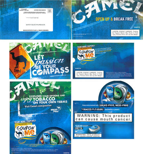 Direct mailing received in March 2011 advertising a new coupon promotion called "Coupon Me" in which Camel customers can visit the brand's website and select which style of coupons they prefer - two coupons for Camel cigarettes, two coupons for Camel Snus, or one of each. Participation is limited to one offer of two coupons per month. The mailing also promotes Camel Snus as smoke-free and mess-free and includes a coupon for a free tin with the purchase of any Camel product. Text: "Let passion be your compass. Explore your options and enjoy tobacco on your own terms."